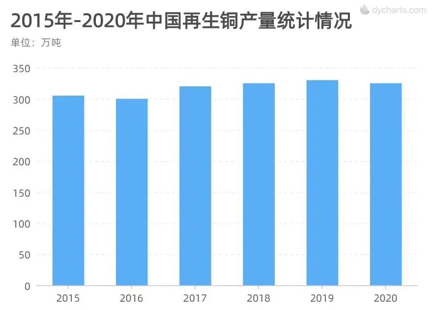 中国再生铜行业经过近年来的快速发展,已经形成了相对完整的产业体系。从产量规模来看,2015-2020年中国再生铜行业产量整体呈平稳上升趋势。2020年,虽然受到疫情影响,但再生铜产量仍然达到325万吨,占铜供应量的比重仍为32.4%。( 中国再生金属)