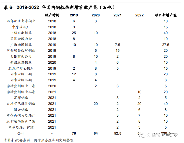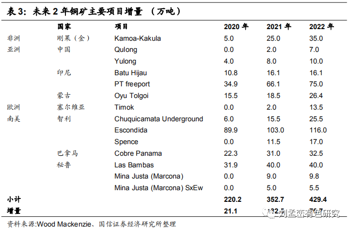 2020-2022年新增产量主要集中在智利和秘鲁,另外印尼的PT Freeport项目正处于地上转地下开采阶段,预计2022年完全转为地下开采,未来两年增量较大;另外紫金矿业位于非洲刚果(金)的卡莫阿项目以及塞尔维亚的Timok项目均有望在2021年实现首期建成投产。