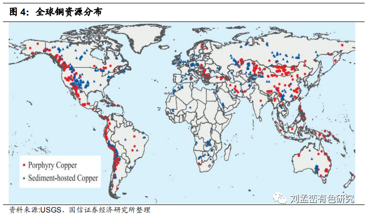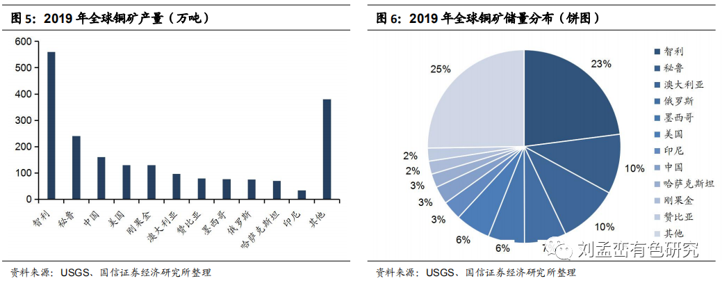 全球铜矿资源比较丰富,美国地质调查局(USGS)数据显示,2019年全球铜储量(经济可采储量)8.7亿吨,资源储量达56亿吨,近10年以来全球铜可采年限始终维持在40年左右。另外铜资源储量较为集中,尤其是环太平洋成矿域(重点为南美安第斯成矿带),其中南美的智利、秘鲁储量分别为2亿吨、0.87亿吨,分别占全球储量23%、10%,2019年两个国家铜矿产量分别占全球27% 和12%。