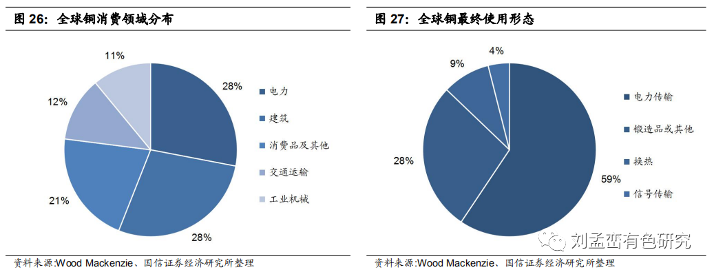 中国作为基建和制造业大国,铜消费占全球近50%,其次是日本、美国、德国等发达国家。我国铜消费领域较为集中,大规模电网建设使得电力领域铜消费占国内铜消费总量近一半;全球范围内铜消费领域分布较为均衡,主要是电力、建筑、交通等领域。从铜的最终使用形态来看,主要是利用铜良好的导电性,电力传导占总量60%,这也决定了铜在涉及电力的新兴领域有着广阔的应用前景,如新能源汽车、光伏、大数据中心等。