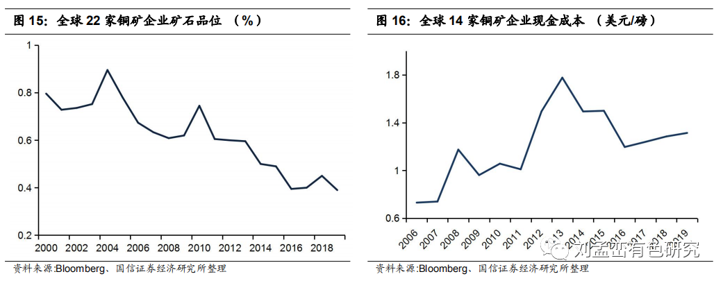 铜价具有明显的成本支撑。铜矿品位长期下降趋势导致采选成本上升。观察全球 22 家铜矿生产企业矿石品 位,近 20 年总体处于下降趋势,品位下降一方面导致矿石采选成本近年来处于 上升趋势,另一方面影响矿石产出。