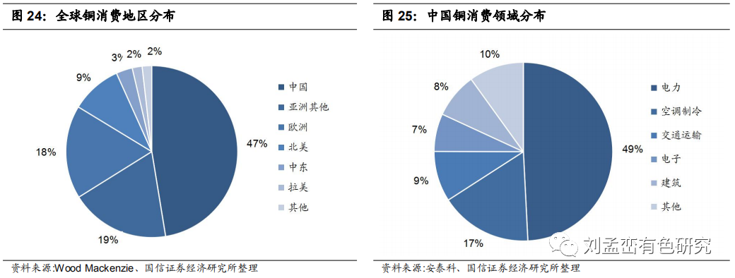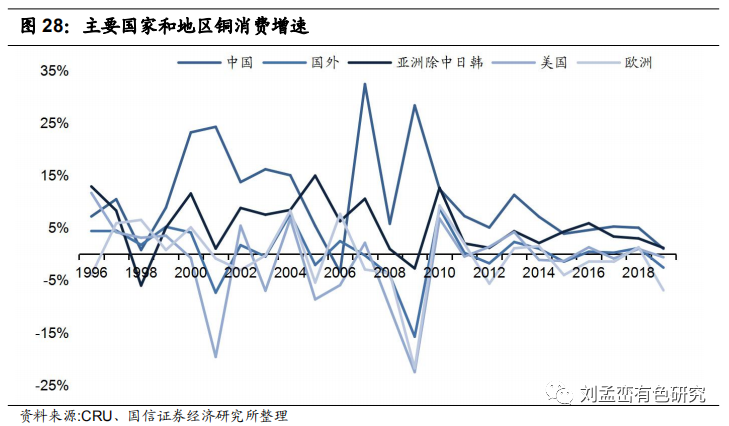 分析各国铜消费增速,可以看出以下几点:一是中国铜消费增速近年来有所下滑,但在各国当中仍居于前列,考虑到中国铜消费占全球近一半,中国始终是拉动全球铜消费的主要力量之一;二是欧美等发达国家铜消费停滞不前,消费增速基本在零附近上下波动;三是亚洲的印度及东南亚等新兴经济体消费增速高,是未来全球铜消费的增长点,但现阶段基数偏低,对全球铜消费的拉动有限,所以近几年中国以外铜消费基本稳定,处于低速增长状态。因此中国铜消费是更加重要的变量。