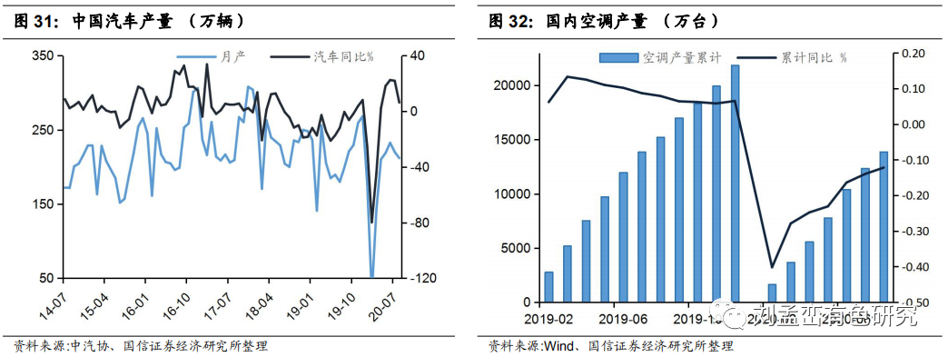 另外两大消费领域空调和汽车需求都表现稳健。根据中汽协的数据,8月我国汽车产销分别完成211.9万辆和218.6万辆,同比分别增长6.3%和11.6%。汽车产销量连续5个月实现正增长,且销量增速连续4个月保持在10%以上。产业在线空调产销数据显示,8月行业总产量同比3.32%,总销量同比2.78%,销量增长主要靠出口拉动,出口同比增7.49%。