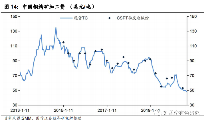 精矿短缺最直接体现为精矿加工费(TC/RC)持续走低。TC是粗炼费,代表从铜精矿经过熔炼、吹炼和精炼加工成阳极铜的费用。RC是精炼费,代表从阳极铜经电解精炼产出阴极铜的费用。自2019年以来矿山劳资纠纷频繁、部分大型矿山地上转地下开采损失部分产量,导致精矿供应紧张,加上中国铜冶炼产能扩张高峰,反映在加工费上则是2019年以来TC持续走低,2020年铜精矿长单TC仅62美元/吨。2020年6月中国铜原料联合谈判小组敲定的三季度TC/RC地板价为53美元/吨及5.3美分/磅,是近年来的最低价,现货TC也跌至50美元/吨以下,直接反映了当前铜精矿供应紧张的局面。