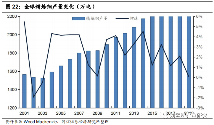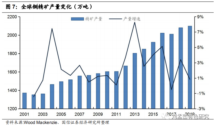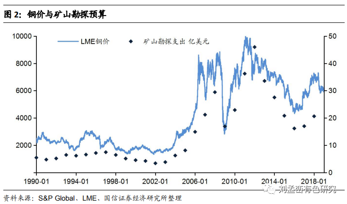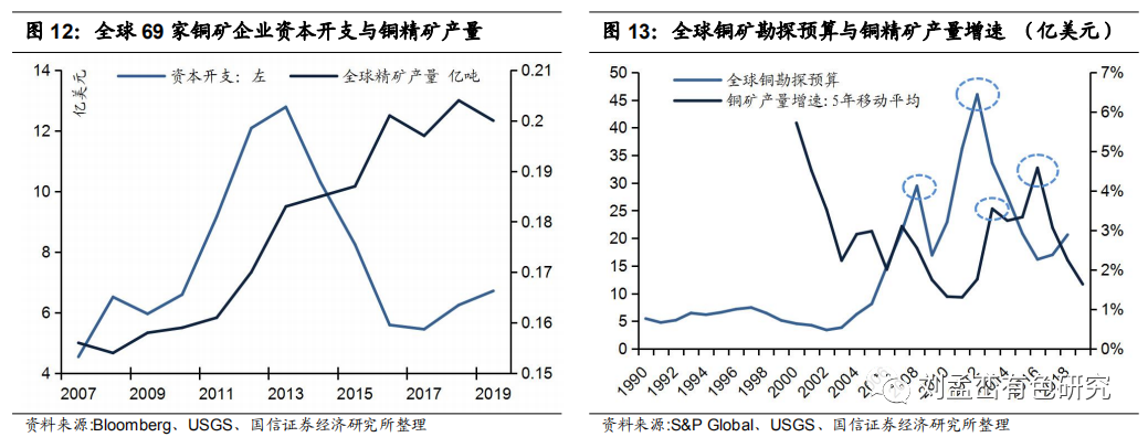一般而言,铜矿山从勘探开发到产出矿石有5年左右滞后期,2008年之前铜勘探投入增加,对应铜矿产量增速在2013年达到顶点;2012年前后铜勘探投入高峰,对应铜矿产量增速在2016年前后达到顶点。从铜矿产量绝对值来看,上一轮铜矿开发热潮的顶点是在2013年左右,对应铜矿产量在2018年达到高点。自2012年之后,铜价单边下行持续了4年,铜矿勘探开发投入也陷入低迷期,导致铜矿产量增速在过去2017-2019年持续下滑。虽然2017年以来随着铜价反弹,矿山企业资本开支增加,但增量并不明显,未来几年铜矿产量增量将持续受低资本开支影响。尤其是2020年上半年疫情对铜市场造成严重冲击,标普发布的《2020全球勘探趋势报告》预计今年铜勘探支出将减少约40%。