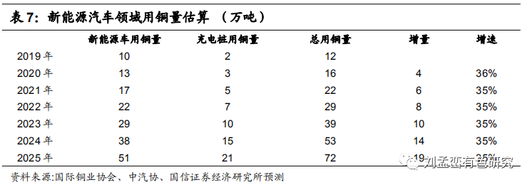 假设新增充电桩与新增新能源汽车数量相等,直流公共充电桩、交流公共充电桩和私人交流充电桩用铜量分别为60kg、20kg和5kg。假设到2025年车桩比提升到1:1。根据上述假设,简单推算出新能源汽车和充电桩的用铜量。从测算数据可以看出,虽然目前新能源汽车领域用铜量相比传统行业偏小,但增速较快,随着基数增加,未来几年可能成为拉动铜消费增长的主要力量之一。