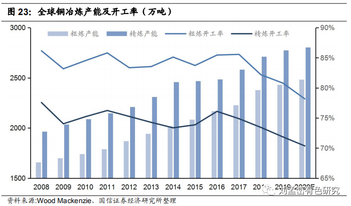 全球铜冶炼产能相对过剩,2017年之前精炼开工率保持在75%左右,近几年全球铜消费增速下滑,但全球尤其是中国的冶炼产能扩产速度并未放缓,导致冶炼开工率下滑,目前在70%左右。这也导致冶炼企业对精矿的需求相对过大,采购竞争激烈,加工费谈判过程中处于劣势。总体来看,铜冶炼产能长期过剩,粗炼产能和精炼产能都不是瓶颈,TC/RC会维持在偏低的水平。