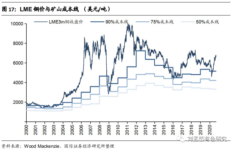 分析过去20年铜价运行区间,在大多数时间,铜价运行在90%成本分位线之上,铜矿90%成本分位线具有较强的支撑作用,只有全球宏观经济遭受大的冲击时,铜价才会跌破90%分位线,在75%成本分位线获得支撑,如2001年、2008年和2015年。根据机构统计今年一季度全球铜矿山90%、75%和50%成本分位线分别为5157美元/吨、4209美元/吨、3327美元/吨,上半年铜价最低点出现在3月19日,最低下行到4371美元/吨,跌破90%成本分位线并在75%成本分位线附近获得支撑。