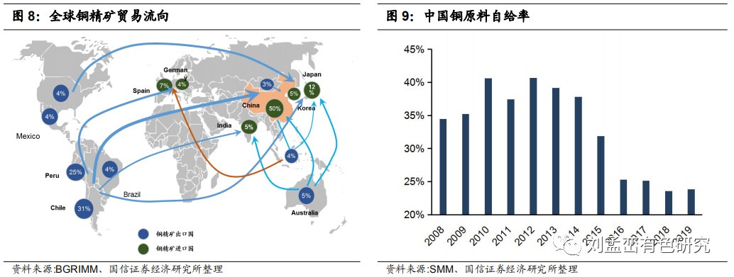 据统计全球可供贸易铜精矿约50%流向中国。我国的铜精矿来源国主要是南美的智利、秘鲁、蒙古等国,其中南美洲的智利和秘鲁两国占我国铜精矿总进口量62%,因此两国疫情往往备受关注。