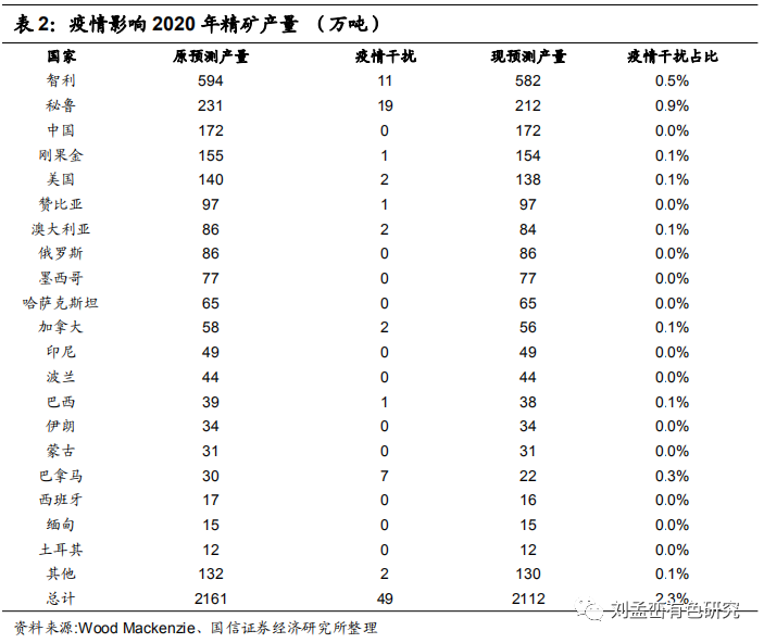 根据Wood Mackenzie统计,仅上半年受疫情影响铜矿减量至少49万吨,其中智利、秘鲁两个主要产铜国就占61%。上半年因疫情造成的矿山干扰率为2.3%,其他原因造成的干扰率为0.8%,如果按历史平均干扰率5%计算,则仅剩1.9%的干扰率空间。由于疫情没能得到有效控制,8月份以来国外二次疫情爆发,秘鲁、智利相继宣布进入新一轮国家紧急状态,可能导致在产项目和新投项目持续受到影响,矿山干扰率可能进一步增加,超过历史平均干扰率,并影响今后两年的矿山投产进度。