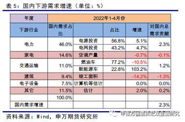 按照铜下游需求的主要五个行业占比测算,今年前4个月铜需求增速约为2.3%。其中,电力行业铜需求拉动2.3%,交通运输设备(汽车)行业对国内铜需求拉动为1.2%,而建筑行业拖累1.3%,家电行业基本持平。