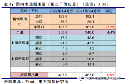 由表格需求量(相当于供应量)来看,今年国内前4个月铜供应与去年同期基本持平。产量增长被进口下降所抵消。