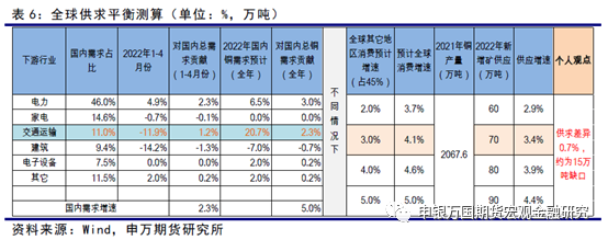 在国内疫情已得到有效控制和下半年需求报复性恢复的前提下,按照各个行业需求占比和增速,预计下游铜需求增速;结合国际铜研究小组的产量数据,预估年度新增精矿量70万吨的情况下,预计全球年度供求缺口约为15万吨。