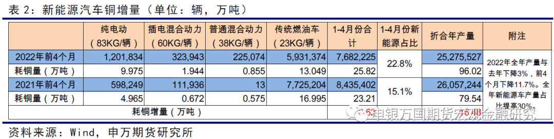 今年前4个月新能源汽车产量占比达到了22.8%,比去年全年的15.1%提高了7.7个百分点。由于新能源汽车产销表现良好,尽管前4个月汽车产量同比下降10.5%,但由于新能源渗透率的提高,经过测算国内汽车耗铜量同比不仅没有下降,反而增加了约2.62万吨。