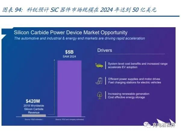 根据 Yole 及科锐业务情况,科锐预计到 2024 年,其 SiC 晶圆可服务市场规模约 11 亿美 元,SiC 器件可服务市场规模达到 50 亿美元。