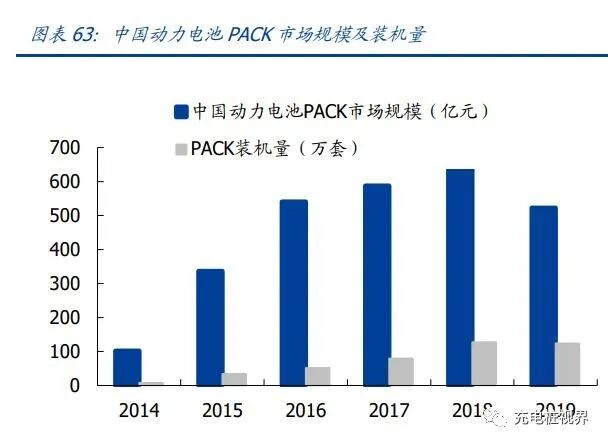 根据前瞻产业研究院数据,从成本拆分来看,新能源汽车动力成本的 50%在于电芯, 电力电子和 PACK 约各占 20%,BMS 与热管理系统占 10%。2020 年全球动力电池 PACK 装机容量为 136.3GWh,较 2019 年增长 18.3%,全球动力电池 PACK 行业市场规模从 2011 年的 39.8 亿美元左右快速增长至 2017 年的 386 亿美元,预计 2023 年全球动力电池 PACK 市场规模将达到 1863 亿美元,2011 年至 2023 年的 CAGR 约为 37.8%,市场空间巨大。2019 年中国动力电池 PACK 市场规模为 522.48 亿元,装机量从 2012 年的 7.85 万套提升至 2019 年的 124.19 万套,CAGR 为 73.7%,2020 年中国动力电池总装机 64GWh,同比增长 2.9%。