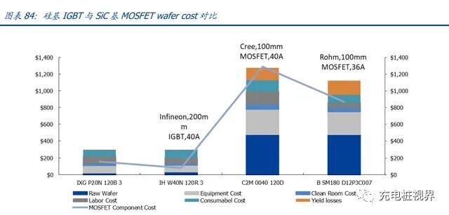 Die Size 和成本是 SiC 技术产业化的核心变量。我们比较目前市场主流 1200V 硅基 IGBT 及 SiC 基 MOSFET,可以发现 SiC 基 MOSFET 产品较 Si 基产品能够大幅减少 Die Size,且表现性能更好。但是最大阻碍仍在于 Wafer Cost,根据 Yole 测算,单片成本 SiC 比 Si 基产品高出 7~8 倍。