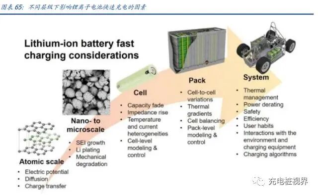 动力电池快充技术壁垒高,制约因素复杂。根据 Lithium-ion battery fast charging:A review,影响锂离子电池快充的影响因素来自原子、纳米、Cell、电池包、系统等各个层次,各层次皆包含众多潜在制约因素。据高工锂电,负极高速嵌锂和热管理是快充能力两大关键。1)负极高速嵌锂能力可避免出现析锂、锂枝晶,从而避免电池容量不可逆衰 减和缩短使用寿命。2)电池升温快会产生大量热,容易短路起火,同时电解液也需要较高导电率,并且不与正负极反应,能抗高温、阻燃、防过充。