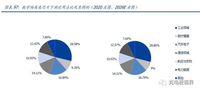 隔离芯片:隔离器件是将输入信号进行转换并输出,以实现输入、输出两端电气隔离的一种安规器件。电气隔离能够保证强电电路和弱电电路之间信号传输的安全性。800V 电驱动系统使得系统具有更高的瞬态共模干扰,就要求逆变器的隔离驱动芯片能够承受超 过 100kV/us 的共模瞬态干扰,否则驱动信号容易出错,导致上下桥臂的功率管直通。此外随着 800V 电压的提高,系统需要更高的原副边绝缘耐压需求。主要体现在两个方面, 一个是绝缘工作电压,对于 800V 电压系统,其跨隔离带的隔离芯片需要承受至少 800V 的绝缘工作电压,保证至少 15-20 年的工作寿命。另外隔离芯片的外部爬电距离的要求也比之前有了很大提高。