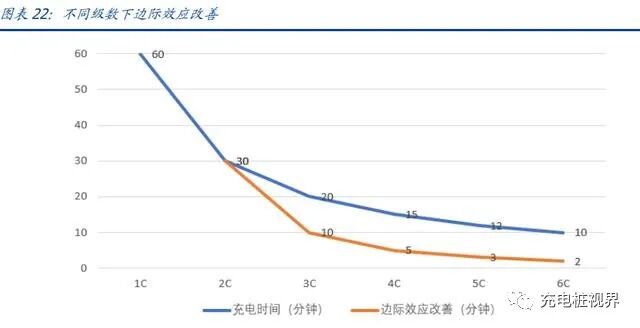 超级充电标准孕育而出。C 的定义:通常,我们将电池的充放电倍率用 C 来表示。对于放电,4C 放电表示电池 4 个小时完全放电时的电流强度。对于充电,4C 表示在给定的电流强度下,充满电池 400% 的电量需要 1 个小时,也即在给定的电流强度下 15 分钟电池能够完全充电。4C 是什么:4C 并非全新指标,而是在传统的充放电指标如 1C、2C 基础上的延伸,是电池充放电性能提升的体现,并且可以看出 C 的级数越高,电池充放电性能提升的边际效果越弱。当电池的充电倍率超过 4C,其技术难度的提升以及电池承受的电流压力更大, 但是技术提升所带来的正向效应变小。因此我们认为,4C 是目前兼具性能提升和电池技术承受能力的最优解。