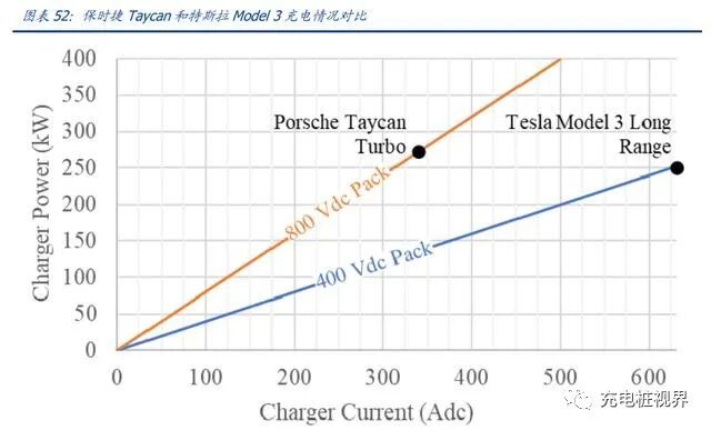 对比采用 400V 总线的特斯拉 Model 3 和采用 800V 总线设计的保时捷 Taycan。Model3 和 Taycan 将充电 SOC 从 5%-80%分别需要 26 分钟和 22.5 分钟。Model 3 的母线电压较低,通过使用非常高的超过 600A 的最大充电电流实现了 250kw 的最大充电功率。保时捷 Taycan 采用 800V 的电池组,通过传统的直流快速充电器和插头提供最大充电电流为 340A,峰值充电功率 270kW。Taycan 获得的充电功率比 Model 3 略高,在 800 V 总线和 500 A 充电电流的情况下,可以达到 400 kW 的功率。