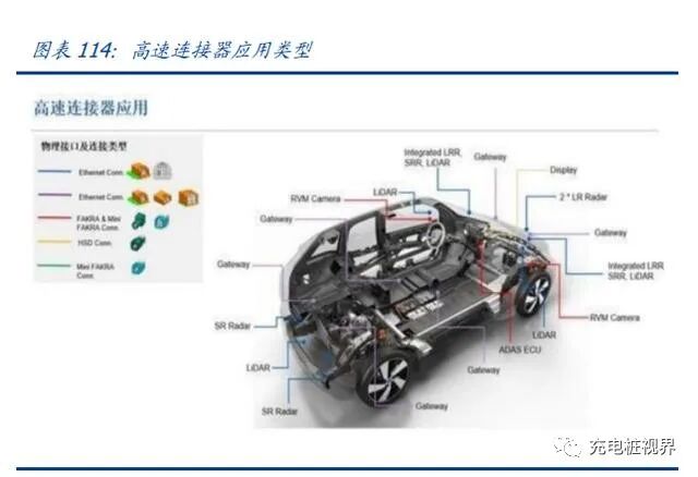 高速连接器是高速数据传输在汽车领域的新战场。高速连接器主要承担汽车无线信号传输及射频信号传输两大功能,其中无线信号传输包含车载 AM/FM、GPS、车联网、遥控控制及车载多媒体设备间信号传输,而射频信号传输则主要包括如摄像头、车载雷达等的各类车载传感器应用。依据性能参数不同可主要分为 Fakra、HFM(高速 Fakra Mini)、 HSD(高速连接器) 及以太网连接器等四大类,Fakra 连接器为汽车行业通用标准的射频连接器;HMF 为 Fakra 升级版,具备更小体积、更高级程度和更好的电气性能等优势;HSD 是一种差分连接器,发展时间较长,主要运用于车载信息娱乐系统、摄像头接口等高速数据短距离传输;以太网连接器则针对智能化程度较高的汽车,用于大规模数据的长距离传输,目前生产成本相对较高但契合智能汽车发展趋势,未来预计应用场景广泛。