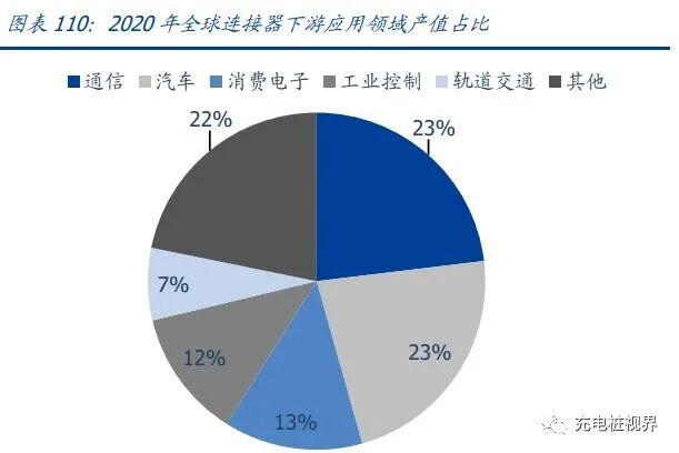 作为电子元器件间的“桥梁”,连接器的下游应用非常广泛。根据 Bishop&Associate 的数据,2020 年连接器下游应用中产值 TOP5 分别为汽车(22.55%)、通信(23.08%)、 消费电子(13.32%)、工业(12.3%)、轨道交通(6.93%)。从产值角度看,连接器最大的前两大应用领域为通信和汽车,2020 年总产值分别达 144.79 亿美元和 141.46 亿美元,其中通信领域需求同比增长 1.5%。