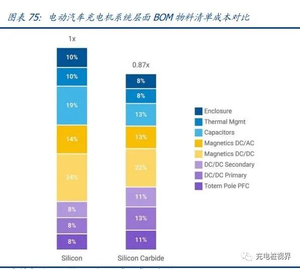 电源转换:车载 DC/DC 变换器的作用是将动力电池输出的高压直流电转换为低压直流电,从而为动力推进、HVAC、车窗升降、内外照明、信息娱乐和一些传感器等不同系统提供不同的电压。使用 SiC 器件可降低功率转换损耗并实现散热部件的小型化,从而减小变压器体积。充电模块:车载充电器和充电桩使用 SiC 器件,能够发挥其高频、高温和高压的优势,采用 SiC MOSFET,能够显著提升车载/非车载充电机功率密度、减少开关损耗并改善热管理。根据 Wolfspeed,汽车电池充电机采用 SiC MOSFET 在系统层面的 BOM 成本将降低 15%;在 400V 系统相同充电速度下,SiC 充电量较硅材料可以翻倍。