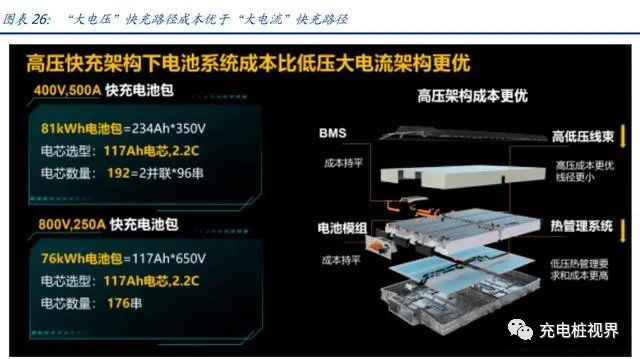 “大电流”与“大电压”路径并存,后者成本更优。为了达到更高的充电功率以达到快充的目的,加大电流或者电压是必须的,目前市面上采用更“大电压”技术路径的公司多于“大电流”。华为表示:当使用“大电压”技术路径时,整车 BMS、电池模组成本与“大电流”路径持平,但是由于不需要考虑大电流影响, 其高压线束以及热管理系统成本要相对较低。