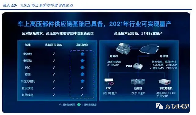 快充的核心在于提高整车充电功率,提高充电功率主要两种方式,加大充电电流或者提高充电电压。目前大多数纯电动汽车的牵引逆变器都使用 600V 的 IGBT 模块,因此将电池组电压限制在 400V 左右的峰值,如果充电电压保持在 400 V,提高电流会导致充电电缆笨重、传导热损失平方级别增长,连接器、电缆、电池的电连接、母线排等的电阻都会发热。将母线电压提高到 800 V,可以使同一根电缆的充电功率增加一倍,要达到 350 或 400kW 的超高充电功率,800V 高压平台应运而生。
