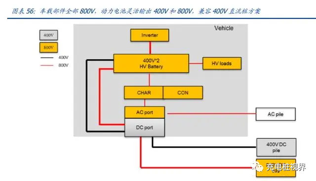 方案三:车载部件全部 800V,动力电池灵活输出 400V 和 800V,兼容 400V 直流桩 方案。典型特征为:直流快充、交流慢充、电驱动、动力电池、高压部件均为 800V;2 个 400V 动力电池串并联,通过继电器切换灵活输出 400V 和 800V,兼容 400V 直流充电桩。这种方案由于动力电池需要特殊设计,以避免电池并联环流潜在问题,因此推广难度较大。