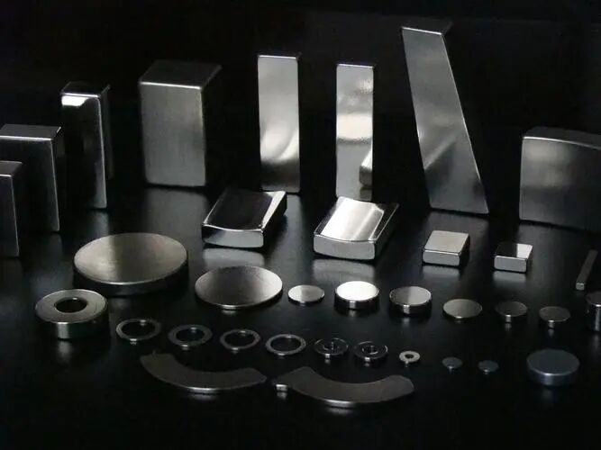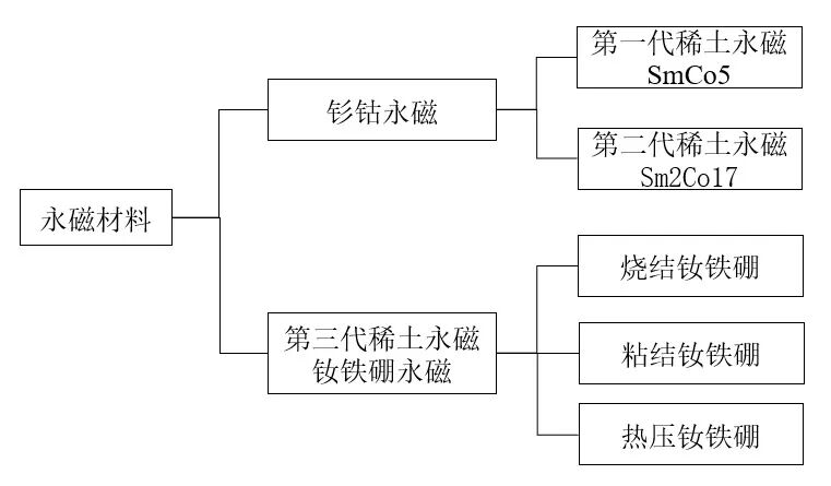 稀土永磁材料是磁性材料的重要种类之一,是将钐、钕等混合稀土金属与过渡金属(如钴、铁等)组成的合金,用粉末冶金方法压型烧结,经磁场充磁后制得的一种磁性材料。相较于传统永磁材料,稀土永磁材料是当前矫顽力最高、磁能积最大的一类永磁材料,已经成为现代工业不可或缺的关键基础材料。稀土永磁材料是20世纪60年代逐渐发展起来的,按开发应用时间可分为第一代钐钴永磁材料(SmCo5)、第二代钐钴永磁材料(Sm2Co17)和第三代钕铁硼永磁材料(Nd2Fe14B)。与钐钴永磁材料相比,第三代钕铁硼永磁材料在磁性能和生产成本方面具备较大优势,基本替代了一、二代钐钴永磁材料,目前已成为产量最高、应用最广泛的稀土永磁材料。![]()