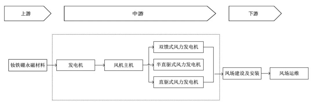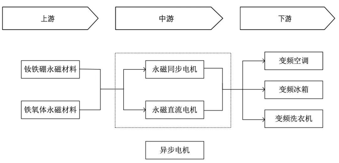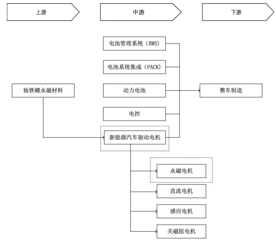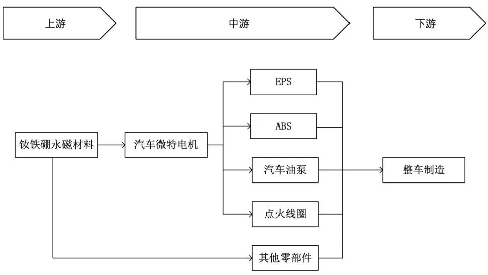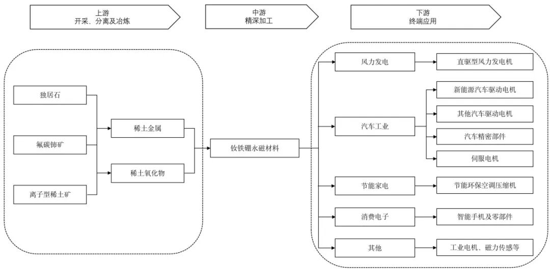 根据中国稀土行业协会和海关总署数据,2021年我国钕铁硼磁材产量21.94万吨,2022年上半年达12.20万吨。国内对高端钕铁硼的需求占钕铁硼磁材总需求的56.60%。国内高性能钕铁硼产量和市场占有率仍有提升空间,从长期来看这也将为国内优秀磁材企业成长提供机遇。我国拥有全球最完备的稀土永磁体产业链,已经成为全球最大的稀土永磁材料出口基地。自2011年以来,中国钕铁硼永磁体的净出口整体维持增长趋势,净出口数量从2011年的2.47万吨,增加到2022 年的5.33 万吨,增幅达115.79%,但净出口增速有所回落,主要是由于我国磁材近年来以电机等终端产品形式出口,同时低端产品出口数量减少、高端成品出口数量增加所致。全球主要国家对我国稀土永磁材料需求日益提高,随着以新能源汽车、风力发电为代表的低碳节能制造产业的快速发展,全球高性能钕铁硼永磁材料的需求有望迎来快速发展时期。高性能钕铁硼永磁材料主要应用于高科技产品,如电机、压缩机、传感器,具体应用领域包括:消费电子产品、传统汽车等传统领域以及新能源汽车、风力发电、节能环保等新兴领域。钕铁硼永磁材料下游行业发展前景良好。一方面传统应用领域国民生活渗透率比较高,尤其是手机、电脑等电子产品应用普遍,发展平稳;另一方面,新能源汽车、风力发电等新兴应用领域是国家的重点发展对象,符合国家节能减排、绿色环保的战略发展规划。在国家颁布的产业政策里,积极鼓励和引导新能源汽车、风力发电、空调、工业电机领域等采用新材料、新工艺,而钕铁硼作为新材料也被国家列为鼓励和重点发展的对象。在多种因素影响和带动下,下游行业应用领域不断拓展,对钕铁硼永磁材料的要求越来越高,促使钕铁硼行业向精细化、个性化、定制化等方向发展。稀土行业与钕铁硼永磁材料行业之间的关系如下图所示:
