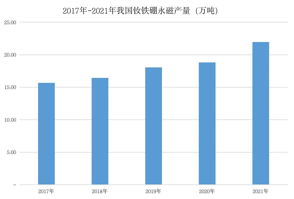 钕铁硼永磁材料主要原料是镨钕、镝、铽等稀土金属。我国是稀土资源大国,拥有全球最大的稀土储量和产量,据美国地质调查局数据,2022年我国稀土矿资源储备量4,400万吨,占全球资源比重的33.85%,位居全球第一;2022年,全球稀土总产量30万吨,我国产量21万吨,占比70%,位列第一。丰富的稀土资源和产量为我国钕铁硼永磁行业提供了充足的原料供应。目前我国已经成为全球最大的钕铁硼永磁材料生产国,产量一直保持着较快增长。根据工信部统计数据,2017年-2021年五年间,中国钕铁硼永磁材料产量增长了39.94%。![]()