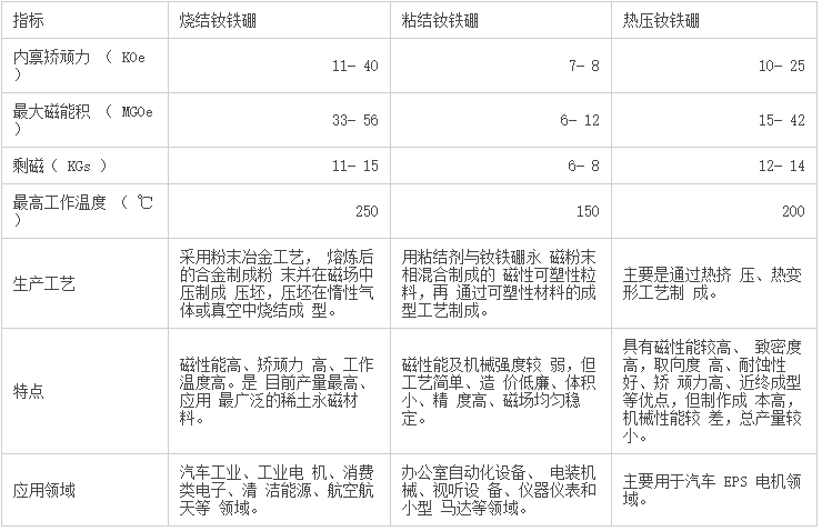 钕铁硼永磁材料按照制造工艺不同可分为烧结、粘结和热压三类,具体对比情况如下表所示: