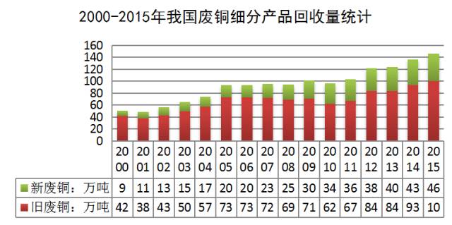 2000-2015年我国废铜细分产品回收量统计