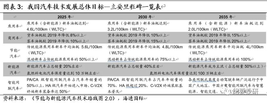根据我国汽车技术发展总体目标,到2025年,混动新车占传统能源乘用车的50%以上,新能源汽车占总销量20%左右;到2035年,混动新车占传统能源乘用车的100%,新能源汽车成为主流,占总销量50%以上。根据我国汽车产业总体路线图规划,到2025年,各类网联式高度自动驾驶车辆广泛运行于中国广大地区;高速快速公路、 城市道路的基础设施智能化水平满足HA级智能网联汽车运行要求。