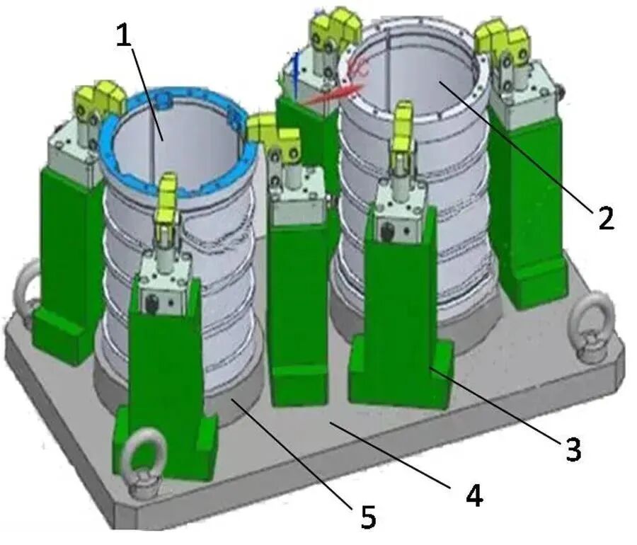 1、2-电机壳 3-夹松结构 4-夹具底座 5-定位支承