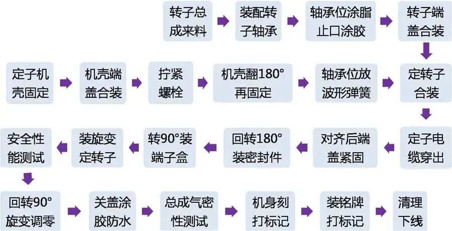 定子总成的通常工艺路线,如图2所示。该路线未涉及机壳内孔的机械加工及定子铁芯的冲压叠铆整形和焊接处理。