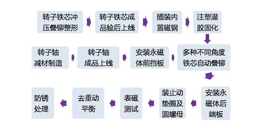 菲索玛特Felsomat公司采用模块化的智能制造集成化方案,创新转子设计,通过软件获取铁芯的合成磁场图,改善铁芯角度和永磁形式,优化工艺路线,进行数字化切削、自动化装配及数据化分析,使电机转子经内置永磁和V形开槽对应产生永磁转矩与磁阻转矩,最终实现电机低速的最大转矩角和高速工况的弱磁。
