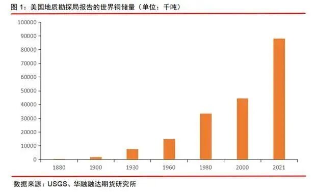 长期视角下:目前铜储量约为8.8亿吨。铜资源总量估计为56亿吨,其中已查明和未发现的铜资源估计分别约为21亿吨和35亿吨。尽管近年来对铜的需求增加了,但储量同时也增加了,世界上可识别的铜比历史上任何时候都多。自1960年以来,平均一直有38年的储量,而且已知资源的数量显著增加(美国地质调查局的数据)。此外,回收利用、革新和采矿勘探的继续发展也有助于铜的长期供应。如果考虑到深海和地壳深处的铜矿资源的话,铜矿资源将会是一个天文数字,其未来的供应远远还未到短缺的地步。