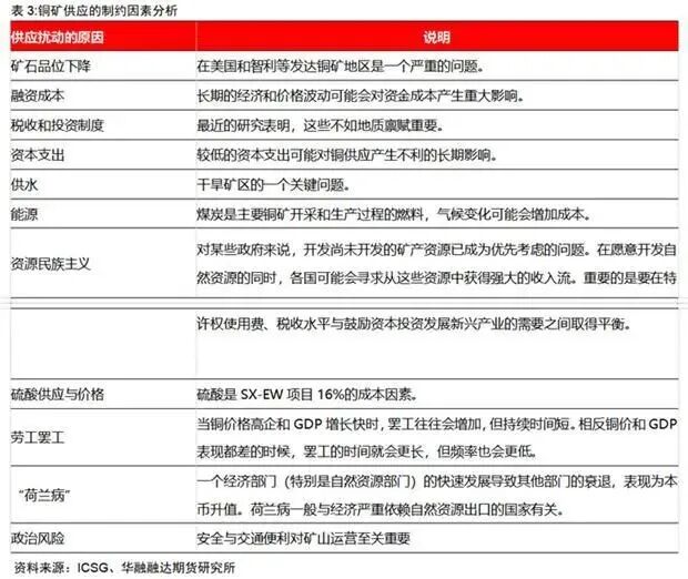 铜供应的制约因素已经成为铜矿长期和短期产量变动的重要变量之一。在表3我们收集整理了相关资料并对其进行了总结。