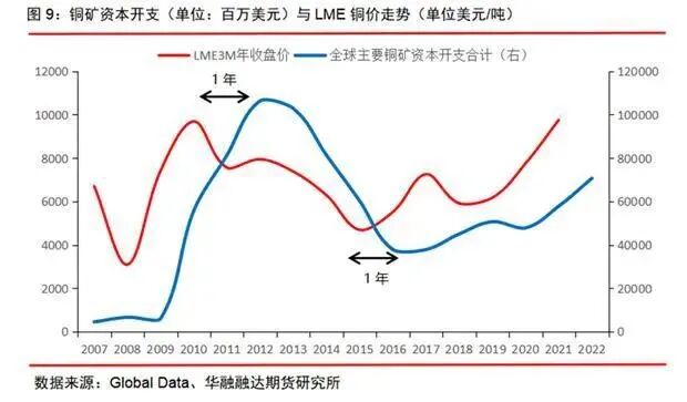 一般而言铜企的资本开支会滞后铜价一年左右见顶和见底,主要原因可归结于铜企决策一般为结果导向型:如果上一个财年铜价疲软、经济下行那么铜企就倾向于在下一个财年缩减开支以减缓财务压力。相反,如果上一个财年铜价表现强势、经济上行那么铜企就倾向于在下一个财年扩张开支以博取更多的回报。