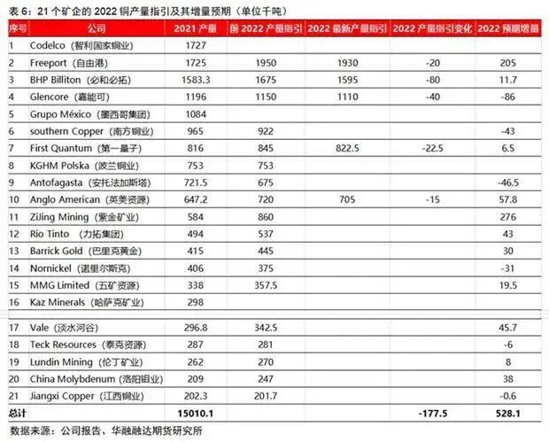 另外进入名单的中国的企业有紫金矿业(601899)、五矿资源、洛阳钼业(603993)、江西铜业(600362),2021年铜精矿产量分别为584千吨、338千吨、209千吨和202千吨。