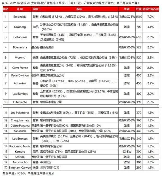 根据ICSG2021年的数据显示,位于智利的Escondida铜矿是一个露天矿也是全球产能最大的铜矿,全球产能占比7%。位列产能第二名Grasberg位于印度尼西亚最高的爪哇山附近,是世界上黄金储量最大、铜储量第二大的铜金矿。它由四个地下矿山和一个露天矿山组成。Collahuasi矿位于智利北部Tarapacá地区的高海拔地区。该露天矿最初于1880年开矿,但由于地缘政治原因,从1930年到1978年停产,直到新矿的发现促使生产重新开始。