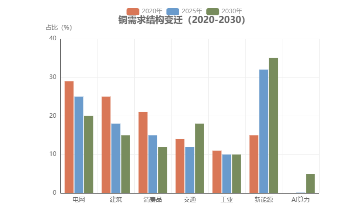 我国在2020年以前,铜主要运用在电网、建筑和家电消费品领域,房地产的下滑加上新能源的崛起,2020年-2025年,铜的大部分使用转向了新能源领域,新能源汽车、光伏与风电建造、电网升级这些都是吃铜大户。铜耗占比从2020年的15%提升至2025年的32%。
