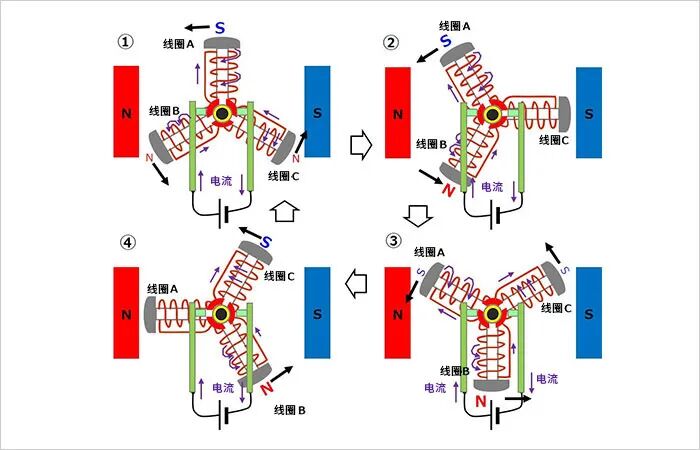 这样,如果不断根据永磁体的位置依次切换流入线圈的电流,则永磁体将沿固定方向旋转。同样,如果使电流反向流动并使合成磁场方向相反,则会逆时针旋转。
