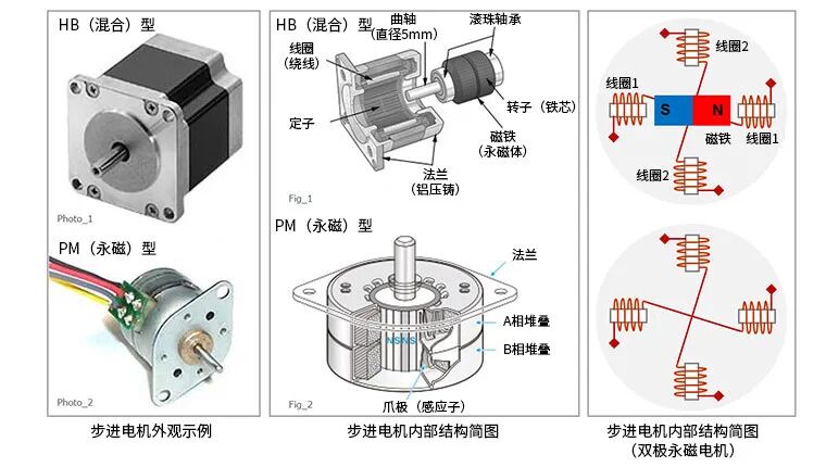 在外观示例中,给出的是HB(混合)型和PM(永磁)型步进电机的外观。在中间的结构图给出的也是HB型和PM型的结构。