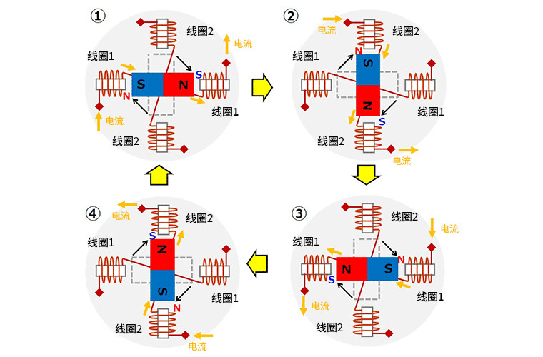 通过电子电路按照上述①至④的顺序切换流过线圈的电流,即可使步进电机旋转。在该示例中,每一次开关动作会使步进电机旋转90°。另外,当使电流不断流过某一线圈时,可以保持停止状态并使步进电机具有保持转矩。顺便提一下,如果将流过线圈的电流顺序反过来,则可以使步进电机反向旋转。