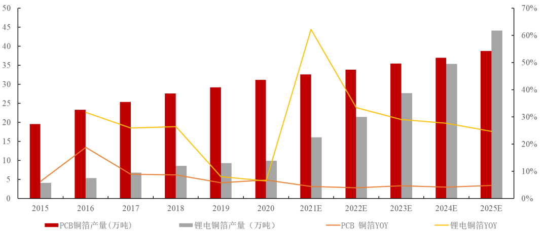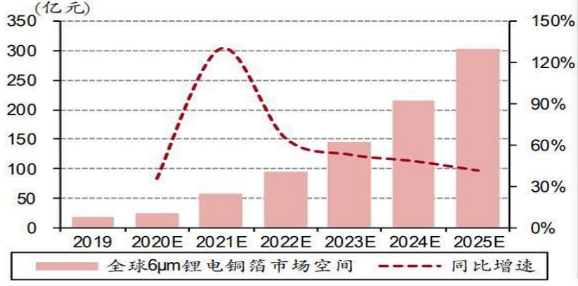未来几年,新能源汽车市场再次进入快速发展阶段,动力电池将带动中国锂电池铜箔市场保持着高速增长的趋势,预计到 2025年中国锂电池铜箔市场需求将达 44万吨,超过标准铜箔成为较大的需求来源,未来五年 CAGR 达到 35%。
